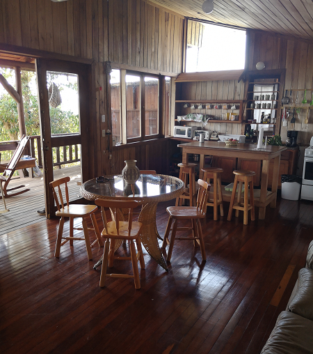A rustic home with spectacular views of Lake Arenal and the windmills! The area is popular with windsurfers and mountain bikers, but a comfortable and scenic destination for all. The front of the house is a covered deck, partially glassed-in with sliding windows, ideal for enjoying the lake view while dangling your legs at the bench seating, or soaking in the hot tub. Inside, there is a kitchen/ living room space with a bathroom. On the other side of the enclosed living space is a bedroom and another full bath. Newly refurbished (under-house supports, floor in bedroom, indoor and outdoor paint, roof, wood re-varnished, fireplace). It's a perfect getaway spot, very private.